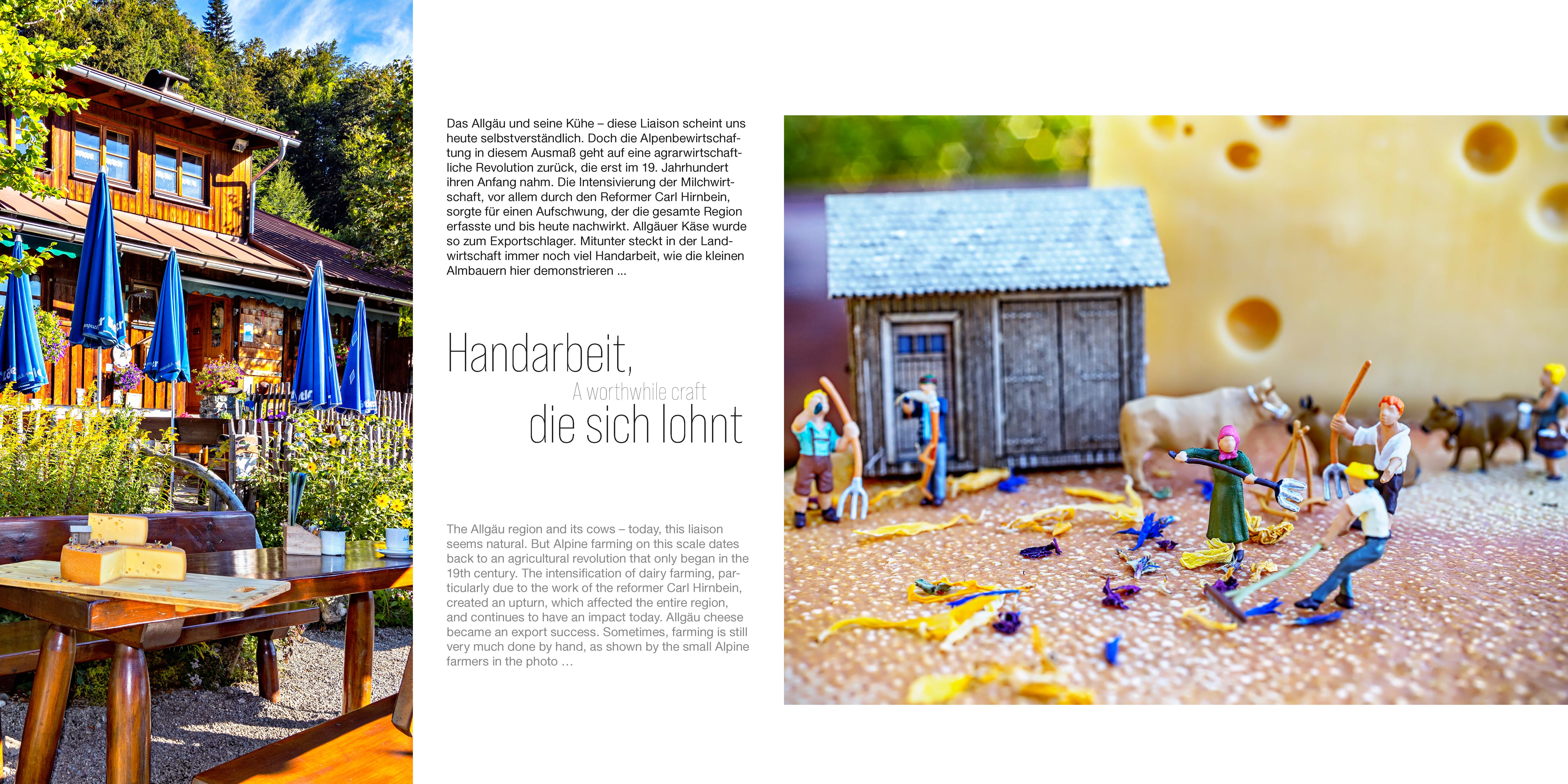 Der zweisprachige Bildband unternimmt einen Streifzug durch das Unter-, Ober-, Ost- und Westallgäu und thematisiert regionale Besonderheiten sowie ausgewählte Sehenswürdigkeiten. Jedes der sechzehn Kapitel wird von hochwertigen Miniaturfotografie-Motiven begleitet. Zudem werden Augmented-Reality-Elemente (Elemente der erweiterten Realität) integriert sein: Einzelne Fotografien von Sehenswürdigkeiten können mithilfe einer begleitenden App, die kostenlos zu beziehen ist, gescannt werden. Daraufhin erhalten Leser weiterführende Informationen beziehungsweise Fotos, Filme und mehr direkt auf ihr Smartphone.