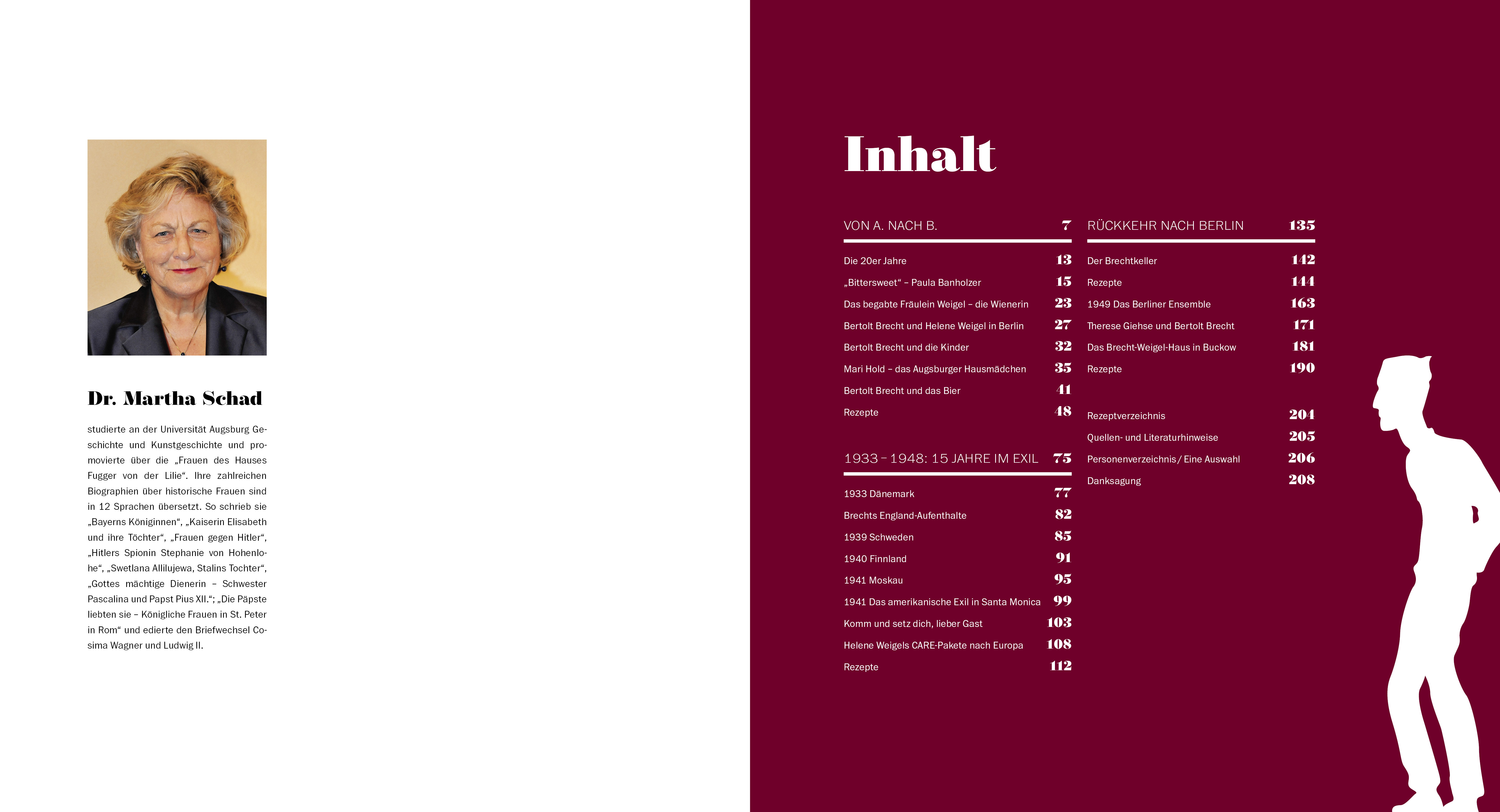 „Zuerst kommt das Fressen, dann die Moral“ … verkündet der Räuber Macheath in der Dreigroschenoper – dieser Satz lässt sich auch einmal auf ganz ungewöhnliche Weise interpretieren: im Leben von Bertolt Brecht und seiner Frau Helene Weigel entdeckt man Essenslust und Gaumenfreuden, Gastlichkeit und Geselligkeit. Mit dieser Doppelbiographie macht sich die Autorin Dr. Martha Schad auf kulinarisch-literarische Spurensuche. Es gibt kaum ein Werk des bedeutenden deutschen Dichters und Dramatikers Bertolt Brecht, in dem es nicht auch um Kulinarisches geht. In dieses Buch sind dazu 50 Originalrezepte aus dem handschriftlichen Nachlass der großen Schauspielerin Helene Weigel eingeflossen.
